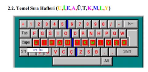 Temel tuşlar klavyenin alttan ikinci sırasındaki U,İ,E,A,Ü,T,K,M,L,Y tuşlarıdır.